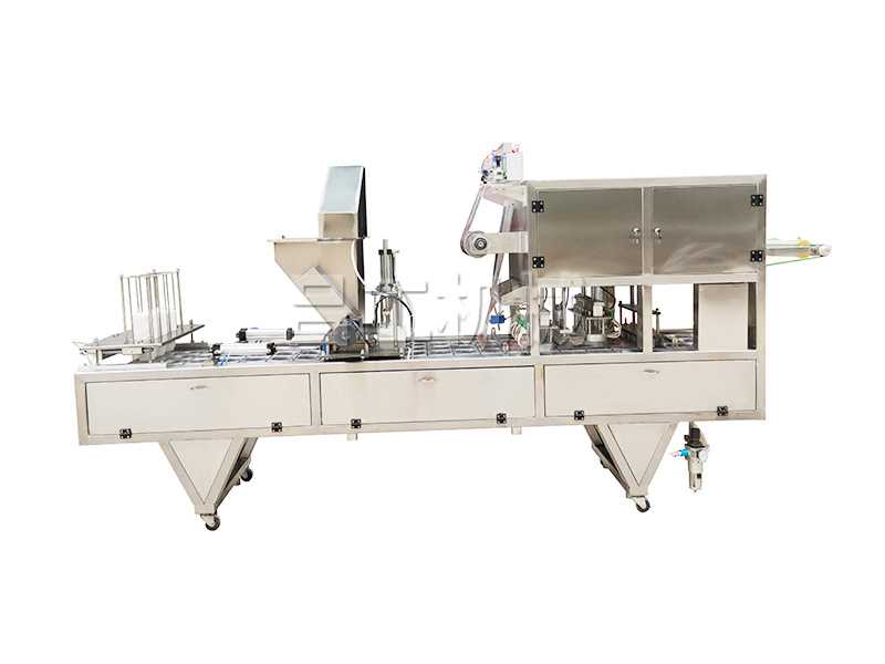 本機(jī)采用合理的機(jī)械傳動(dòng),功能齊全,灌裝、封口、切邊、制品推出,廢料收卷,印碼等自動(dòng)化工作,可節(jié)約人力,降低成本。本機(jī)有二次熱封裝置,料杯/碗/盒與封膜經(jīng)過前后二次熱封,封口牢固可靠。